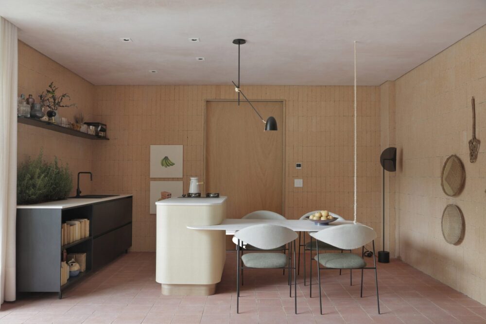 烹飪區以黑色櫥櫃搭配象牙色中島,形成低調而富有對比感的現代感調性。廚房的檯面選用西班牙品牌的複合材質 Dekton,它是一種由玻璃、瓷質與石英原料混合製成的耐刮、耐汙漬、耐熱材質,兼具實用性與材質美感。餐廳區的設計也搭配了中島配置,一張白色餐桌與中島相連,並透過天花板繩索提供額外支撐,使桌面呈現懸浮狀態。這樣的巧思讓視覺上不僅乾淨利略,也提供了座位擺放上的更多彈性。餐桌周圍的當代餐椅,椅面以綠及白色布料包覆、搭配纖細椅腳,視覺上更顯輕盈俐落,與整體大地色調和諧呼應。除了自然光之外,空間照明亦精心設計。空間中有落地燈搭配月亮造型燈罩,頂部照明則模仿工作燈造型,提供柔和而富層次的光線。整體設計在功能性與美學間取得平衡,使廚房與餐區不僅具備實用性,也成為視覺焦點,營造出既宜人又具現代藝術感的生活場域。