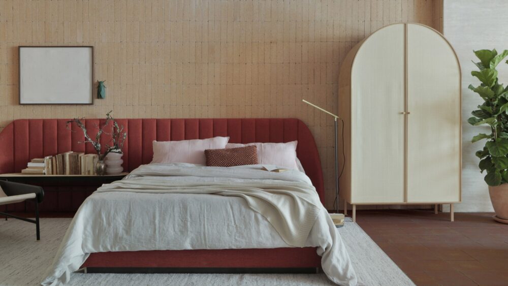 臥室牆面以類似公共區域的裸色細磚交織出規律的垂直線條,呼應赤陶地磚,奠定空間裡安定的基調。家具設計多以弧形語彙呈現,例如拱形木製衣櫃,消解大型家具的壓迫感,並為空間增添幾分禪意。床頭板選用沉穩磚紅色,搭配垂直繃布線條,與橫向磚牆形成趣味幾何對比。這個客製化床頭板延伸出床頭櫃,使家具搭配更有整體感。浴室與臥室相連,延續了臥房的色彩邏輯,卻以更為大膽的選色展現出強烈的劇場感,將衛浴空間昇華為一場沉浸式的視覺饗宴。牆面以蕨綠色再次帶出自然的氣息,搭配圓弧形鏡面與銅製五金件,打造柔和雅致的光影。洗手台不再只是家具,更可成為一個藝術裝置。沿襲自臥房的細長紅磚,以俐落的 L 型懸空結構組建而成,展現了幾何結構的力學美感。兼具開放式收納的功能,底部可置放毛巾與盥洗用品。臥室與浴室的細節都在不經意間為空間注入藝術性與生活氣息,使整體氛圍兼具溫暖、舒適與現代感,完美呈現北歐 Hygge 精神融入巴西居住場域的生活美學。
