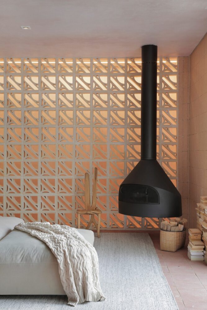 公共區域的一大視覺焦點是由裝飾性空心磚構成的 cobogó 屏風,團隊將其置於客廳中央,如同一件藝術作品,讓光線穿透鏤空圖樣,在室內投射出層次分明的光影,形成動態的視覺景致。客廳的家具搭配則採取舒適與雕塑感並存的原則,包括奶油色沙發、造型獨特的木質座椅以及編織地毯,透過層次堆疊,營造出安定且放鬆的空間氛圍。懸吊於中央的黑色壁爐以俐落線條和雕塑感造型為柔和大地色調注入現代張力,下方堆疊的木柴與藤編收納籃呼應自然材質,增添生活感與溫暖氣息。空間設計在材質、比例與光線之間取得精準平衡,細膩的鏤空屏風與俐落的壁爐形成強烈對比,而家具與裝飾細節則延續柔和的自然語彙,使整體空間既適合靜心休憩,也能作為社交與娛樂的場域。設計中對細節的把握,例如地毯紋理、座椅曲線與裝飾品的擺放,都呈現出精緻的美學品味,完美呈現屋主嚮往的生活的質感。