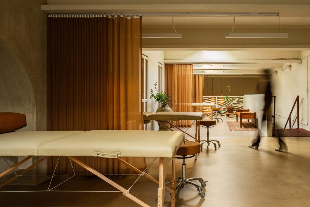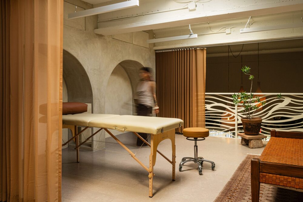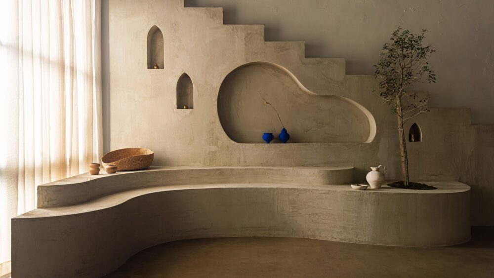 設計團隊對空間的整體佈局從一進門就有循序漸進的規劃。映入眼簾的拱門、壁龕與弧形的內嵌式設計元素,引導訪客穿行於一連串層層遞進的空間之中。動線由開放的公共區域逐步過渡至更為私密的場域,在轉折與包覆之間形塑出如同儀式般的行進節奏,使整體空間在移動過程中流露出沉靜而內斂的氛圍,也讓客人更能放鬆身心,享受獨一無二的消費體驗。入口處設置了一面具有雕塑感的灰泥牆體,透過層層退階的輪廓塑造出豐富的立體表情。牆面同時整合了燭台壁龕、弧形座席以及一座栽植小樹的植栽槽,讓功能與造型自然融合。不僅形成空間中的視覺焦點,更讓前來消費的客人,在此有停頓與休憩,在進入下一個步驟之前有所停頓。其起伏流動的曲線與溫潤的沙色調,令人聯想到沙漠中綿延的沙丘地景;而呼應這種柔和語彙,位於二樓上方的客製化米白色欄杆也以圓潤的鏤空曲線構成圖樣,使整體空間在細節之間延續有機、流動的設計語言。