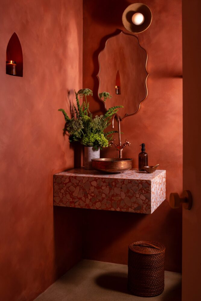 與接待區截然不同的空間,即是空間內不的一處供聚會與活動使用的公共休憩區。這裏被深邃的石榴紅色調所包覆,設計團隊表示,此色彩旨在「喚起文化傳承的濃厚底蘊,同時帶有貝都因帳篷般柔軟而包覆的氛圍」。空間中融合了多樣元素:傳統的阿拉伯燈籠、地毯與水煙壺,與當代家具相互並置。沿牆設置的內建長椅鋪滿了觸感細膩的軟墊,在溫暖的色澤襯托下,建構出一處極具社交溫度的場域。在這個多功能的靈魂區域,刺青愛好者們能在此自由交流、分享靈感,讓空間不僅是物理的交會點,更成為藝術文化與社區情感產生共鳴的共生場域。這種獨特的色彩語彙也延續至小巧的化妝室之中。質地溫潤的粉色石材平台上,放置著一只充滿歲月痕跡的古董銅盆作為洗手盆。在柔和而濃郁的色調中,金屬的冷冽與石材的細膩相互輝映,於微小處呈現出帶有異域氣息的空間細節,讓人彷彿置身於一場穿越時空的文化感官之旅。