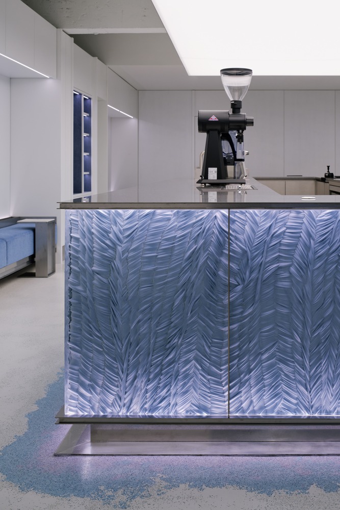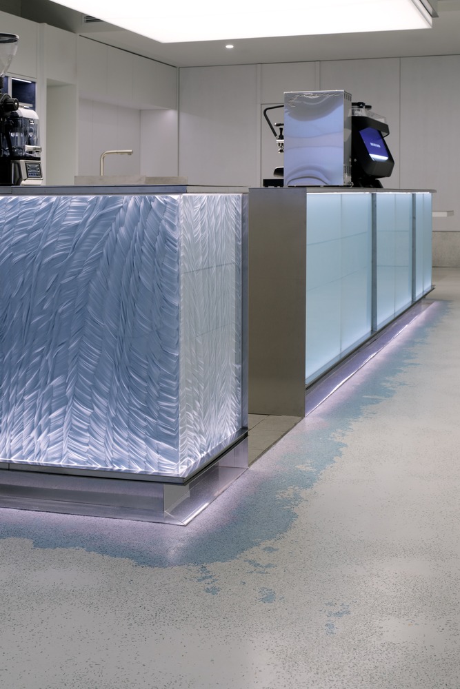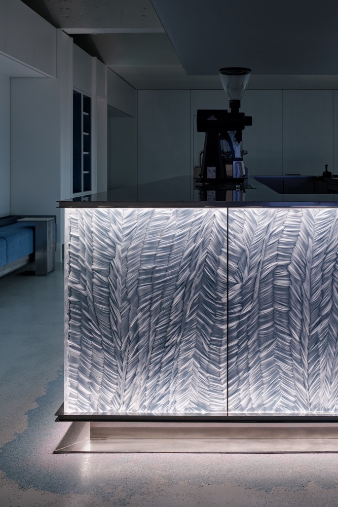 進入咖啡廳後,首先會看到懸掛於主吧檯上方、微微向下突出的 Barrisol 軟膜燈具。最初的設計概念被構想為彷彿穿透海面、灑落至水下的光線意象。以此核心裝置為起點,柔和的光暈向四周緩緩擴散,充滿整個空間,同時細膩地勾勒出位於咖啡館中心、專注沖煮咖啡的咖啡師身影。利用從燈具底部與側邊雙向照射出的光線,傳達出明確的空間訊息——這裡正是體驗展開的起點,引導每一位來訪者自踏入的瞬間,便感受到場域的核心與溫度所在。自 Barrisol 傾瀉而下的柔和光線,更延續映照至主吧檯的正面與側邊立面。吧檯外觀以壓克力與 Jesmonite 材料搭配製作,前方表面彷彿承載光芒的海面,散發出溫潤而透亮的質感;霧面壓克力的加入,則為空間增添層次與細膩的光影變化,使整體氛圍更顯深度與靈動。除壓克力之外的區域採用金屬飾面處理,不僅突顯吧檯人員的專業形象,也強化主吧檯穩重而扎實的量體存在感,在輕盈光感與厚實材質之間取得恰到好處的平衡。