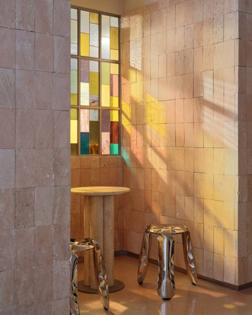 再往空間的深處走,材質與色彩的配置開始轉換,引入了大理石地板與更濃郁的色調,呼應場域在夜間轉變為酒吧的氛圍。空間逐漸出現深紅色調,像是具有光澤感的紅色飲品櫃與酒紅色的座椅、地毯及燈具。通往廚房與衛浴的走廊牆面與地面也覆以相同色系的紅色面板,形成一致且富有沉浸感的視覺氛圍。色彩的運用與空間動線呈現相同的漸層脈絡,前段區域以柔和的黃色與淡粉色開場,而越往深處則轉向更沉穩紮實的色調。設計團隊希望打造一組呈現氛圍的色彩配置,一種能被感受到但不會過於搶眼或影響整體空間的色彩。根據設計團隊的說法,材質的選擇也希望讓室內空間能與阿拉木圖的建築語彙與在地風景產生呼應。哈薩克飯店、共和宮、Arasan 浴場等當地地標的外牆上常見的含貝化石的石灰石也在此咖啡廳被重新以室內牆面的形式呈現。彩繪玻璃則以著名的教堂 Ascension Cathedral等地標為靈感來源,用更現代的方式重新打造室內空間。