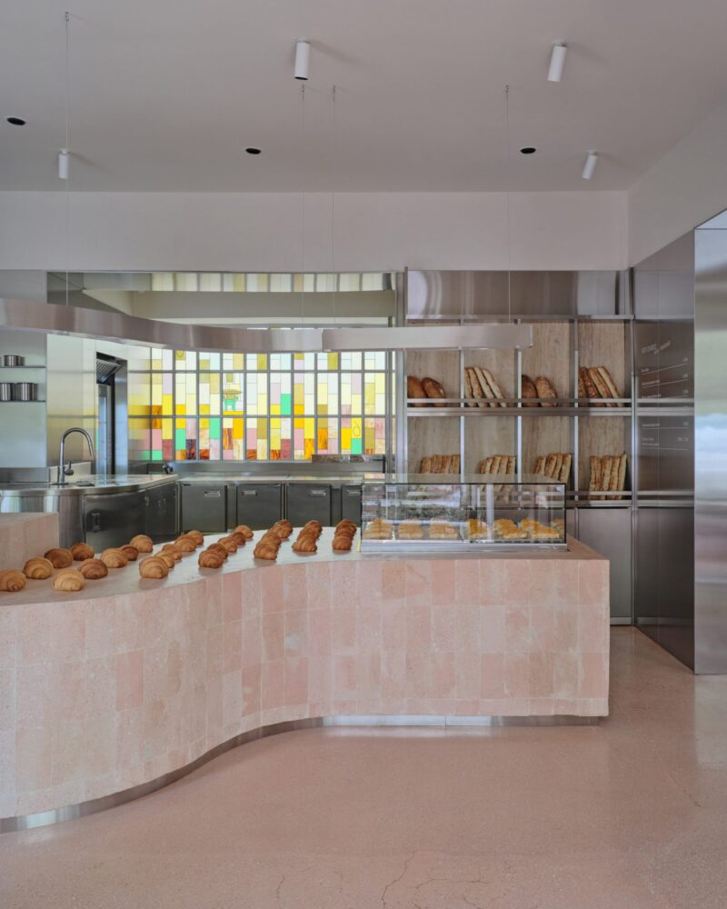一座弧形的石灰石吧台貫穿入口區域,一側設有吧檯座位,另一側則為開放式烘焙區,形成功能分明的空間配置。粉色調的水磨石地面與吧台相呼應,同時與不鏽鋼材質的牆面、廚房設備以及雕塑感十足的天花板燈具形成鮮明對比。前方牆面沿線設置了嵌入式長椅座位,搭配一體的粉黃色小桌,營造出舒適而具設計感的休憩角落。牆面上懸掛的氈製壁掛作品,來自當地設計工作室 Dunie,為空間注入手作質感。整體材質的運用追求著微妙的平衡:溫潤自然的表面與精準反射的材質互相呼應。石灰石中富含化石紋理,增添了空間深度,而不鏽鋼元素,如弧形吧台燈具,則提供清晰而鮮明的對比。在中央座位區,水磨石地板與石灰石牆面彼此映襯,多款木質與石桌子搭配深綠色座椅,呈現多層次的視覺效果。兩扇大面積窗戶搭配了客製的木質百葉窗,使光線的明暗與色調得以靈活調節。為延伸百葉窗的語彙,設計團隊在中間加入了多層次木皮壁板,增添細節。客製家具與各式品牌的設計作品巧妙佈置於同一場域,例如雕塑感十足的仿充氣椅和桌椅合一的座位,為整體空間增添俏皮與趣味。